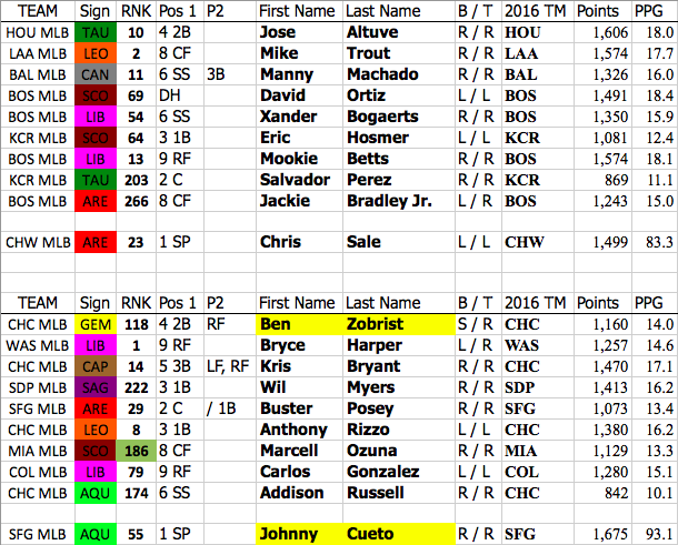 One more note about the formatting: you might notice how Matt Wieters is the only non-injured player whose name is not in bold typeface, which indicates that he would not be a current starter at his position on his astrology team (Gemini) - that honor goes to fellow All-Star reserve Jonathan Lucroy. Going back to the top, these players are arranged by their positions in the batting order in which they came into the game, so it's not a representation of numbers. If it were, Josh Donaldson would be at the top, as his point total so far has surpassed all other position players in the sport. In fact, the only players to surpass him are the aforementioned teammates Cueto and Bumgarner, and the hands down best pitcher in the game...